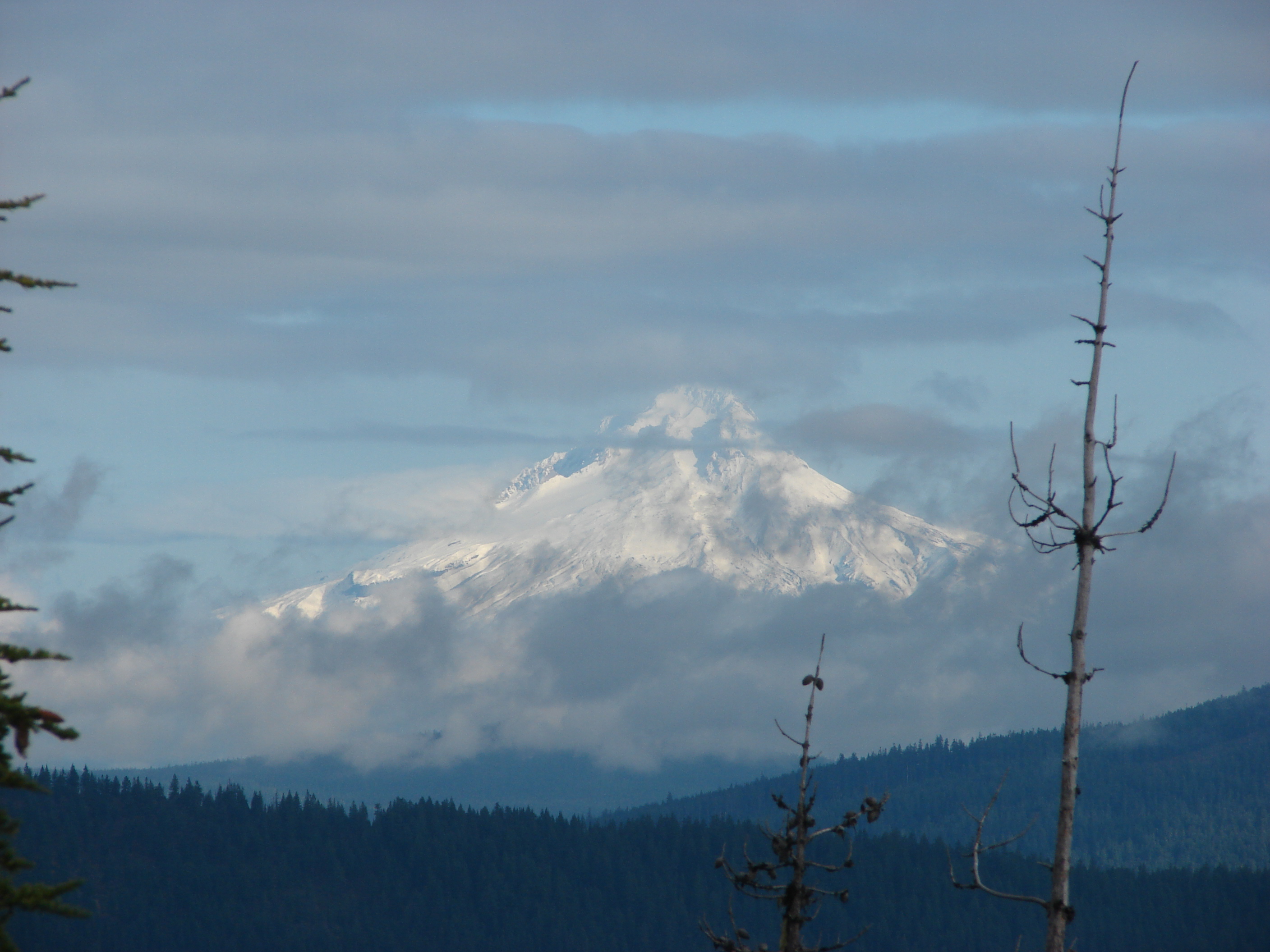We arrived at the summit and easily picked up the official trail. We had a fairly good view of Mt. Hood despite the presence of some clouds and a great view of Olallie Butte.