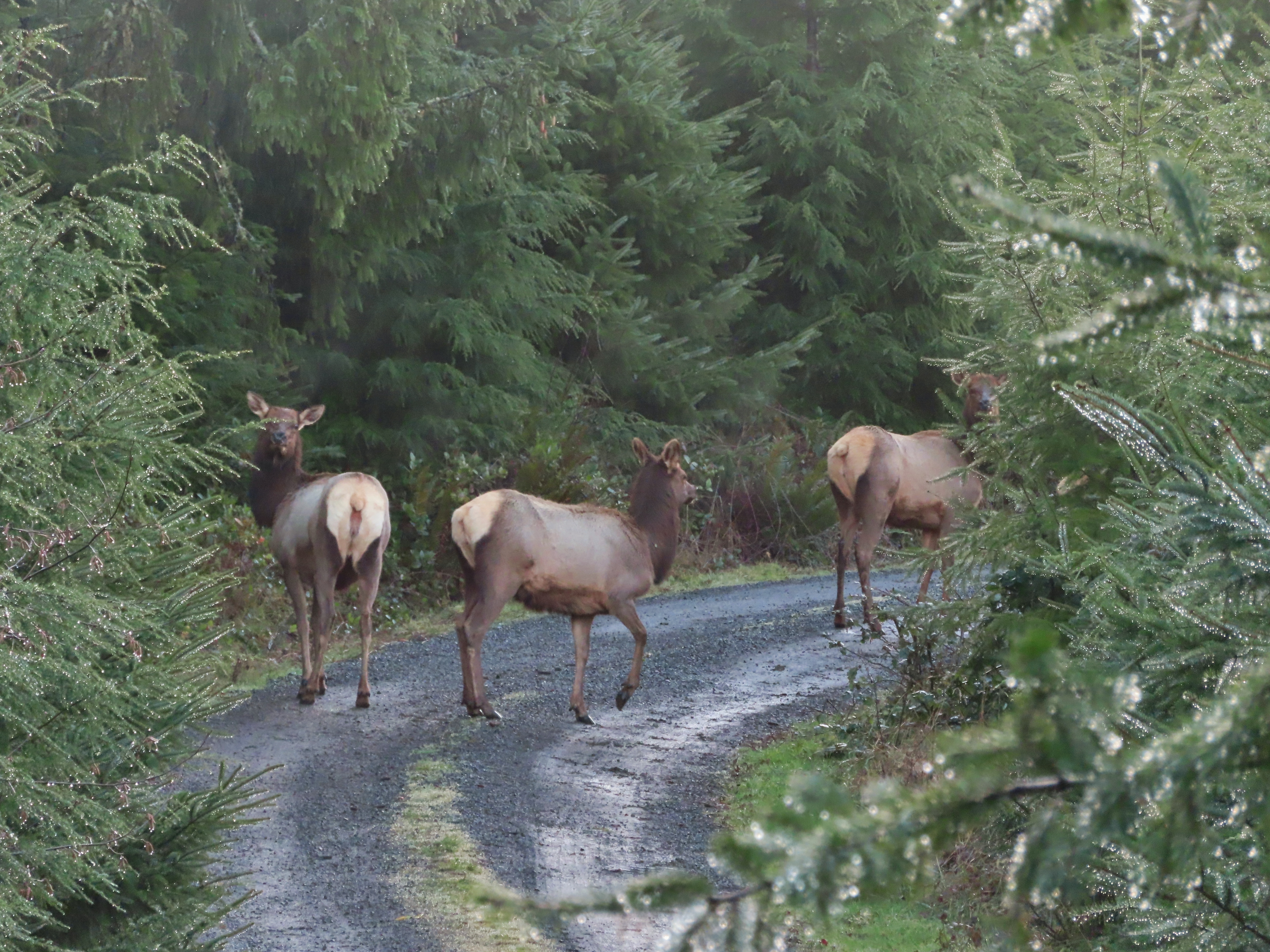 We had stayed on Road 200 through which climbed uphill via a wide curve. As we gained elevation we spotted a couple of elk in the brush on the hillside above.