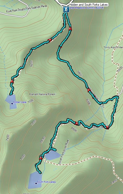 For the last hike of our week in Etna, CA we had chosen Hidden and South Fork Lakes in the Trinity Alps Wilderness. (Featured hike #91 in Sullivan’s “100 Hikes/Travel Guide Southern Oregon & Northern California” 4th edition.) This was both the shortest hike and drive of the week which would allow us to get home as early as possible. We began the hike at the Carter Meadows Summit Trailhead which is right next to a helipad. This area was hit pretty hard by the 2021 Haypress Fire.