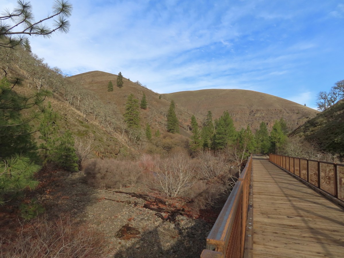 Reeder describes a 5.2-mile out-and-back hike beginning at the Wahkiacus Trailhead west along the Klickitat River to the site of a missing trestle which separates the eastern section of the Klickitat Trail from the western portion. With a nearly two-and-a-half-hour drive time from Salem a 5.2-mile hike is a little short to make the drive worthwhile, so our plan was to start with Reeder’s hike and then head out along the trail in the opposite direction from the trailhead and hike along Swale Creek for about an hour-and-a-half before heading back to the car.