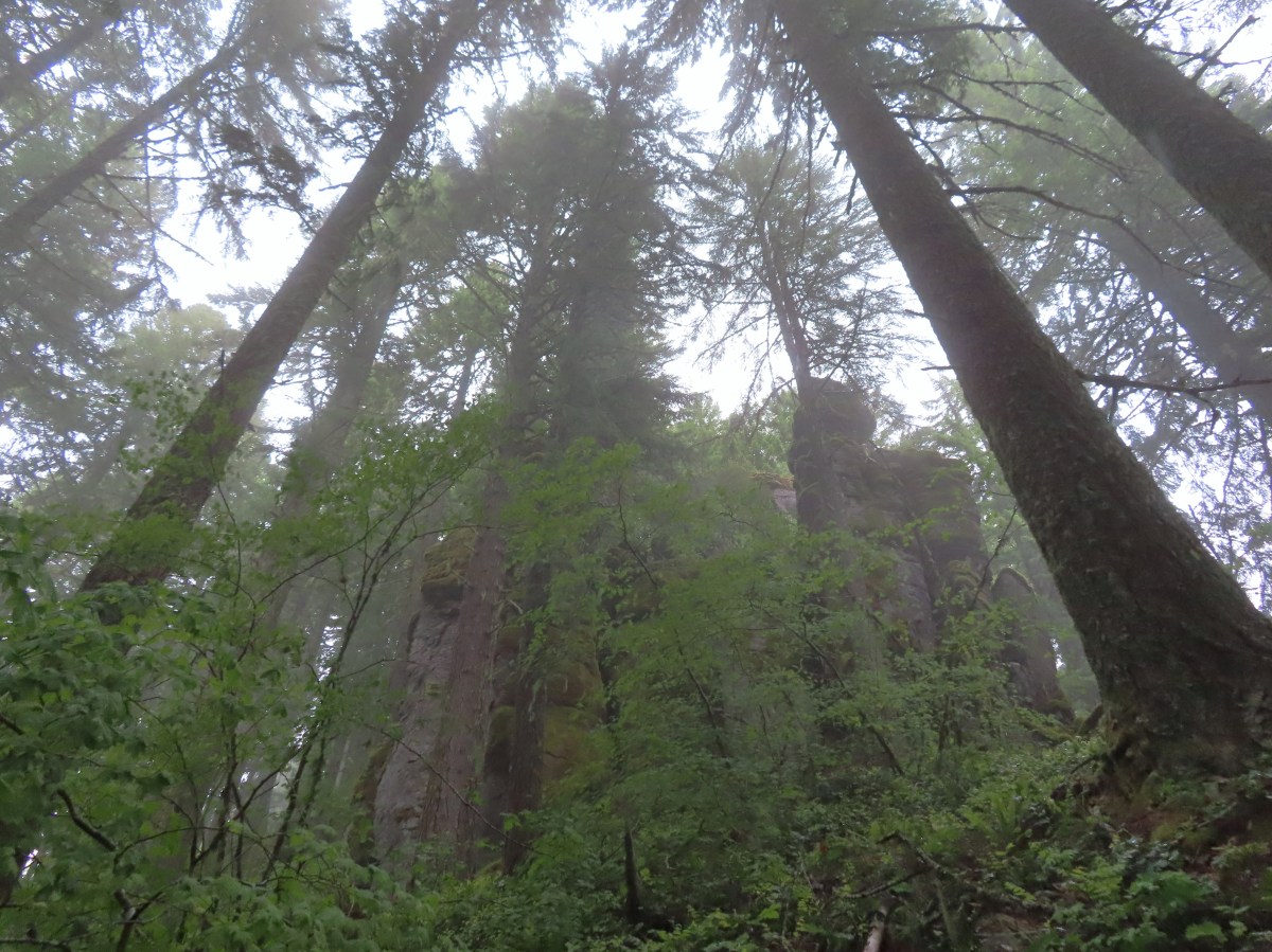 It was hard to tell if it was actually raining or if the low clouds/fog was just leaving the trees and plants damp but either way drops were falling from overhead as we climbed a series of switchbacks. These led us past some nice rock formations in the first mile and a half.