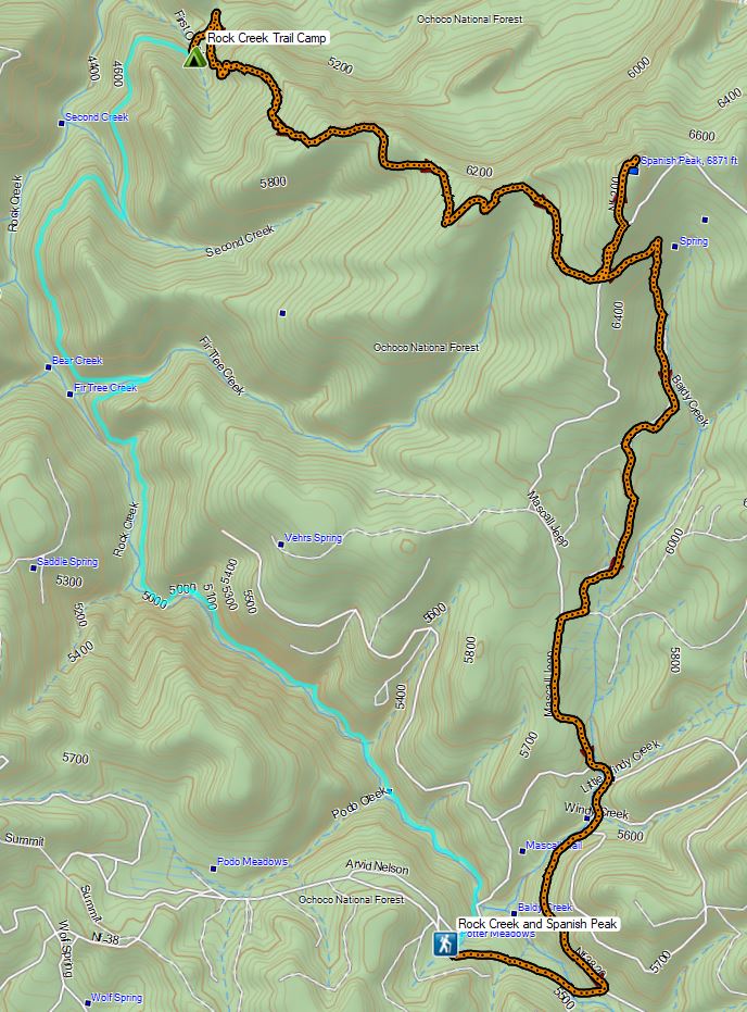 After spending the night camped near First Creek along the Rock Creek/Ochoco Mountain Trail we got an early (6:30am) start to hopefully climb up the 2000 plus feet to the summit of Spanish Peak before the day got too hot. According to Sullivan’s map (which matched the Forest Service’s map) it was 5.3 miles to the summit.