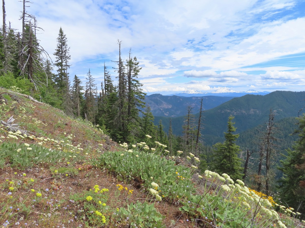 The views from Spring Prairie included a string of Cascade peaks from Diamond Peak to Mt. Jefferson and more beargrass.