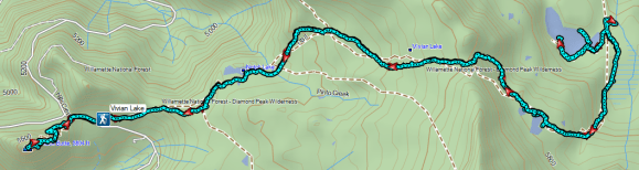 We spent some time at the waterfall then headed back to the car and drove home. It had been just under a mile with a little over 200′ of elevation gain for Pool Creek Falls. It had been an interesting day with wilderness lakes, a summit viewpoint, and a waterfall on trails in various conditions. One word of warning regarding FR23 – the paved section has some massive holes/dips and a number of sunken sections requiring alert driving. For once I had actually been looking forward to reaching the gravel portion of the road. Happy Trails!
