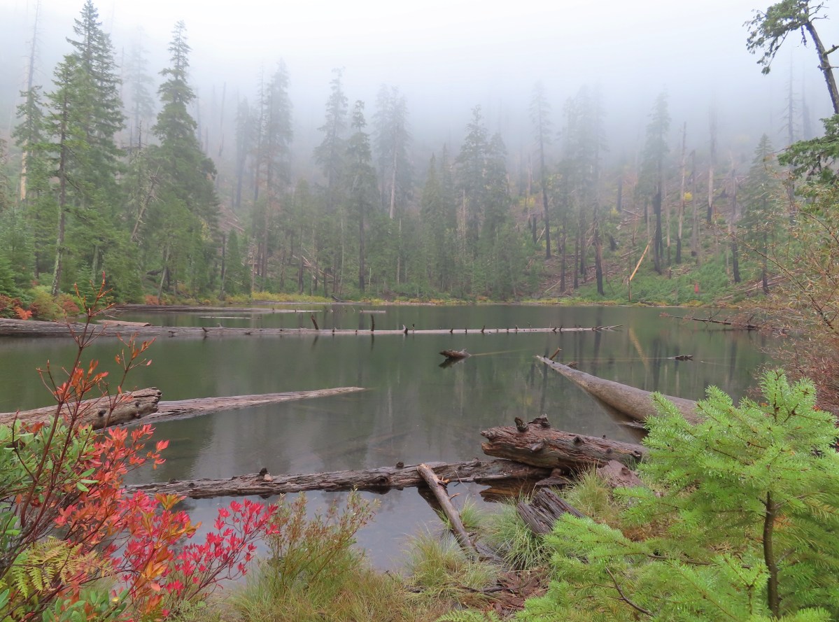 To the left was the Babyfoot Lake Rim Trail. Sullivan’s longer option here include following this trail 0.9-miles to a viewpoint above the lake. Given the fog that seemed pointless, and it also looked like that trail was in need of some maintenance.