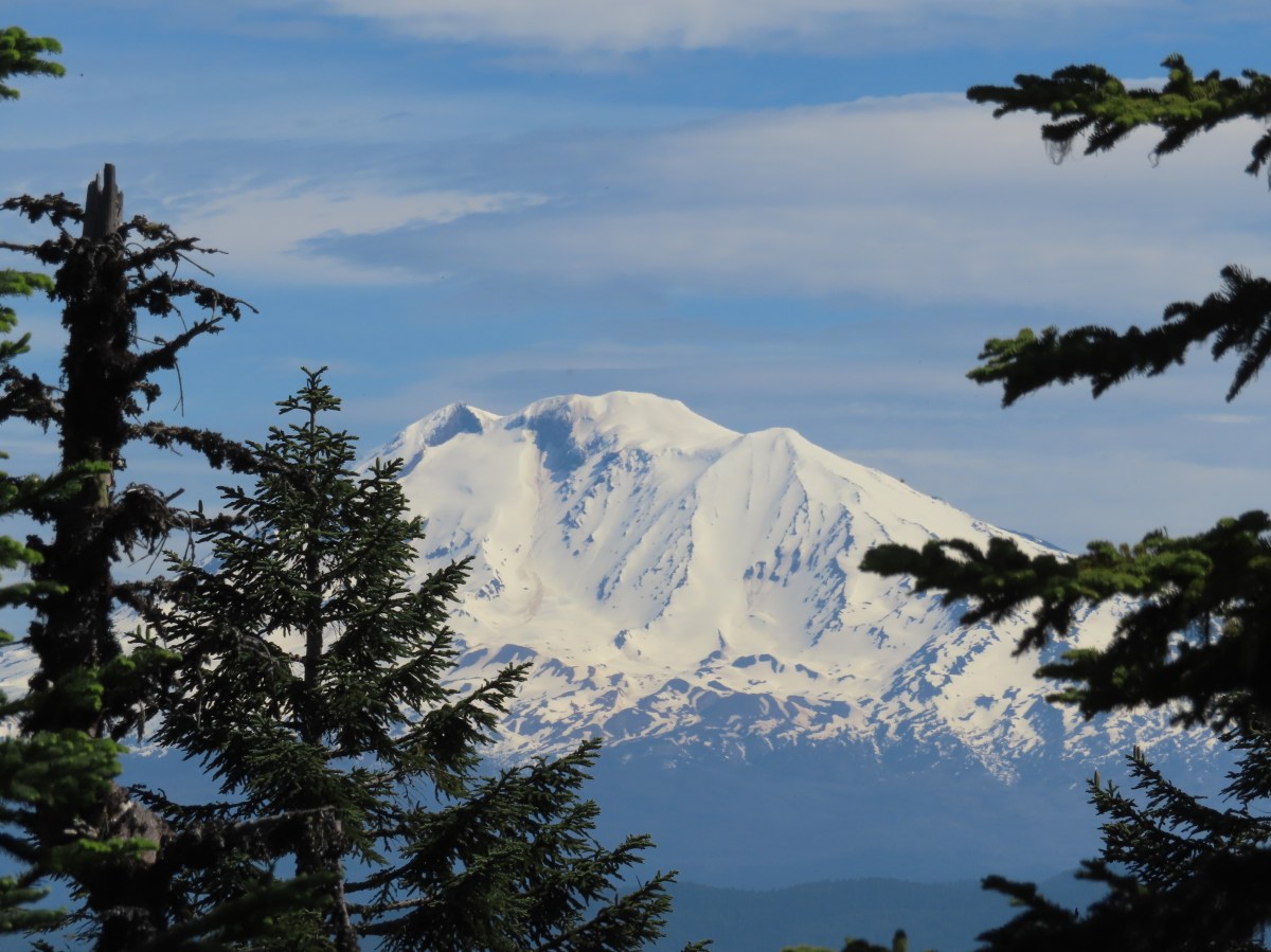Pelican Butte on the left and Mt. McLoughlin on the right. The peaks in the Mountain Lakes Wilderness are behind and to the right of Pelican Butte then the small, closer hump is Imagination Peak. To the right of Imagination Peak and slightly further back is Lost Peak and then further to the right (left of Mt. McLoughlin) is Brown Mountain (