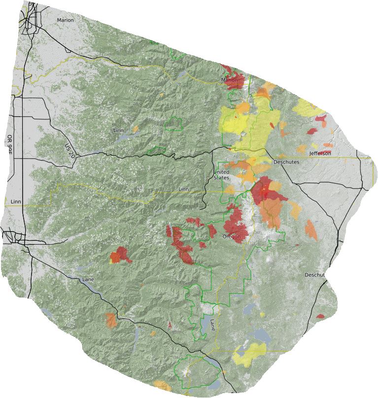 The yellow bulge, Mt. Hood, Black Crater and Black Butte to the north.
