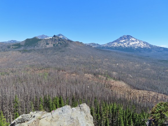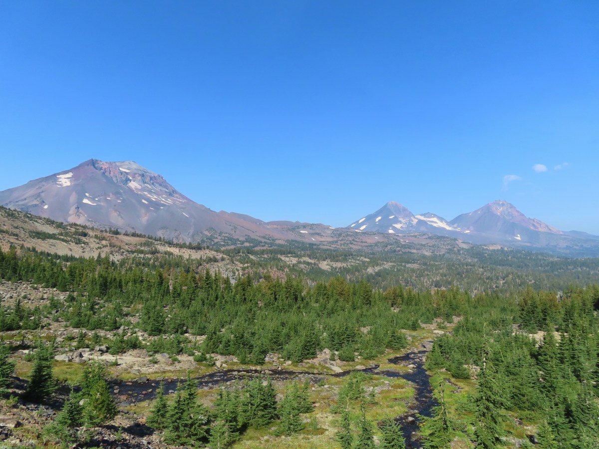 The Park Meadow Trail spends most of its time in the 2012 Pole Creek Fire scar which burned nearly all the trees leaving views of the Three Sisters and Broken Top through the snags. The trail also loses 350′ of elevation for the first 3.9-miles to Wychus Creek.