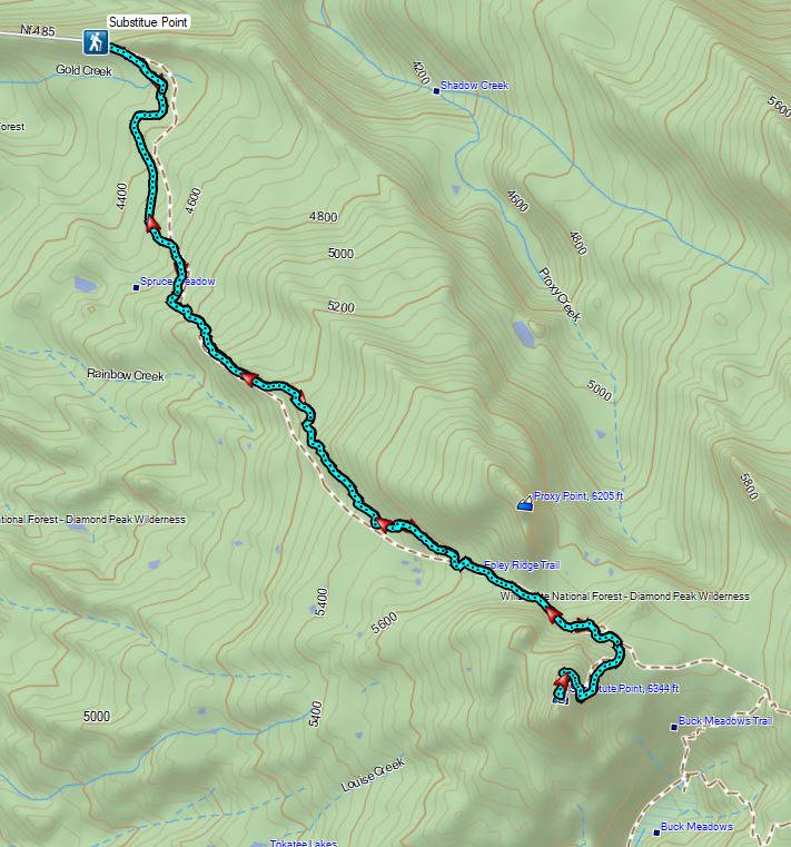I simply retraced my steps from here back to the trailhead. There were a few more wildlife sightings along the way and a few more trail users. The elevation gains after Wychus Creek were a mean trick given it was now warmer while I was heading uphill but there was an occasional cool breeze and it wasn’t too hot of a day to begin with (low 60’s).