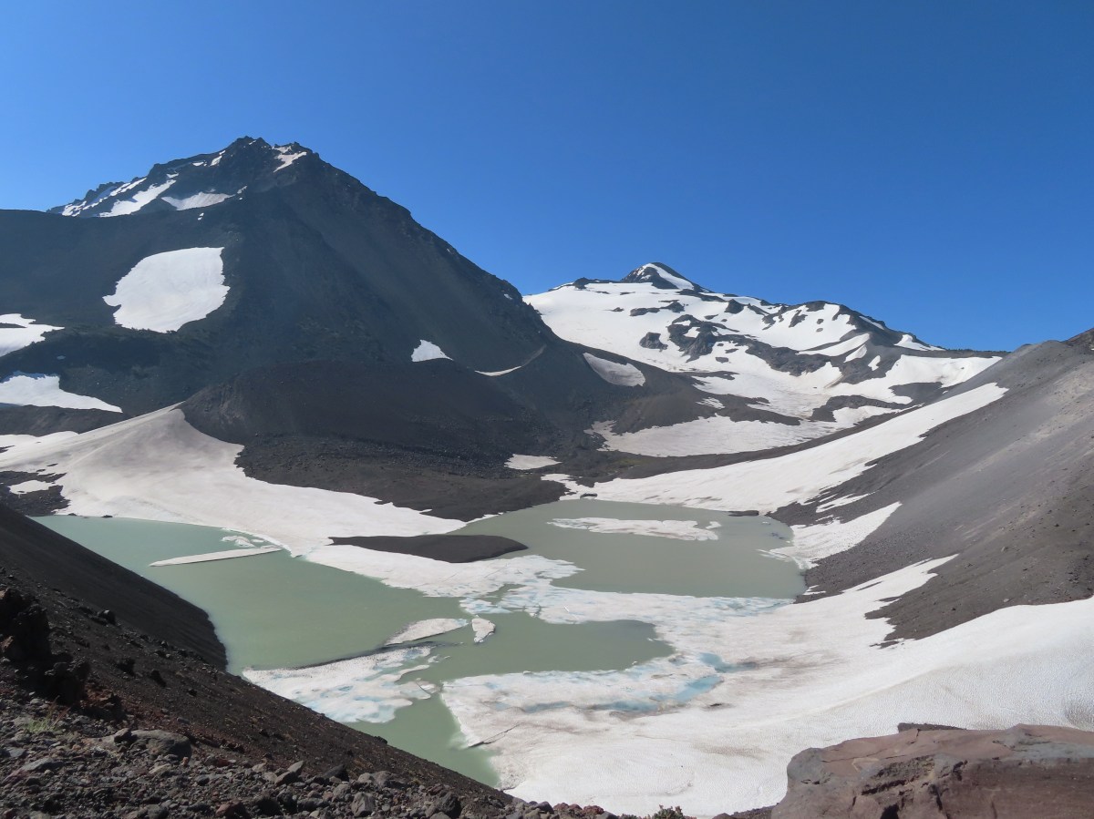 I wasn’t planning on going beyond Golden Lake, but I had left that option open depending on time and how I was feeling. On our backpacking trip we had continued up to a tarn almost a mile (and another 500′) and set up camp. We wound up not staying there though when we got spooked by the sudden arrival of smoke and a visible smoke column on the far side of South Sister. It was a rookie mistake as the fire wound up being over 40-miles away. Now that I was back 11 years later I couldn’t pass up the opportunity to visit the tarn and our almost campsite again. I followed a path along the eastern shore to the outlet creek then headed uphill.